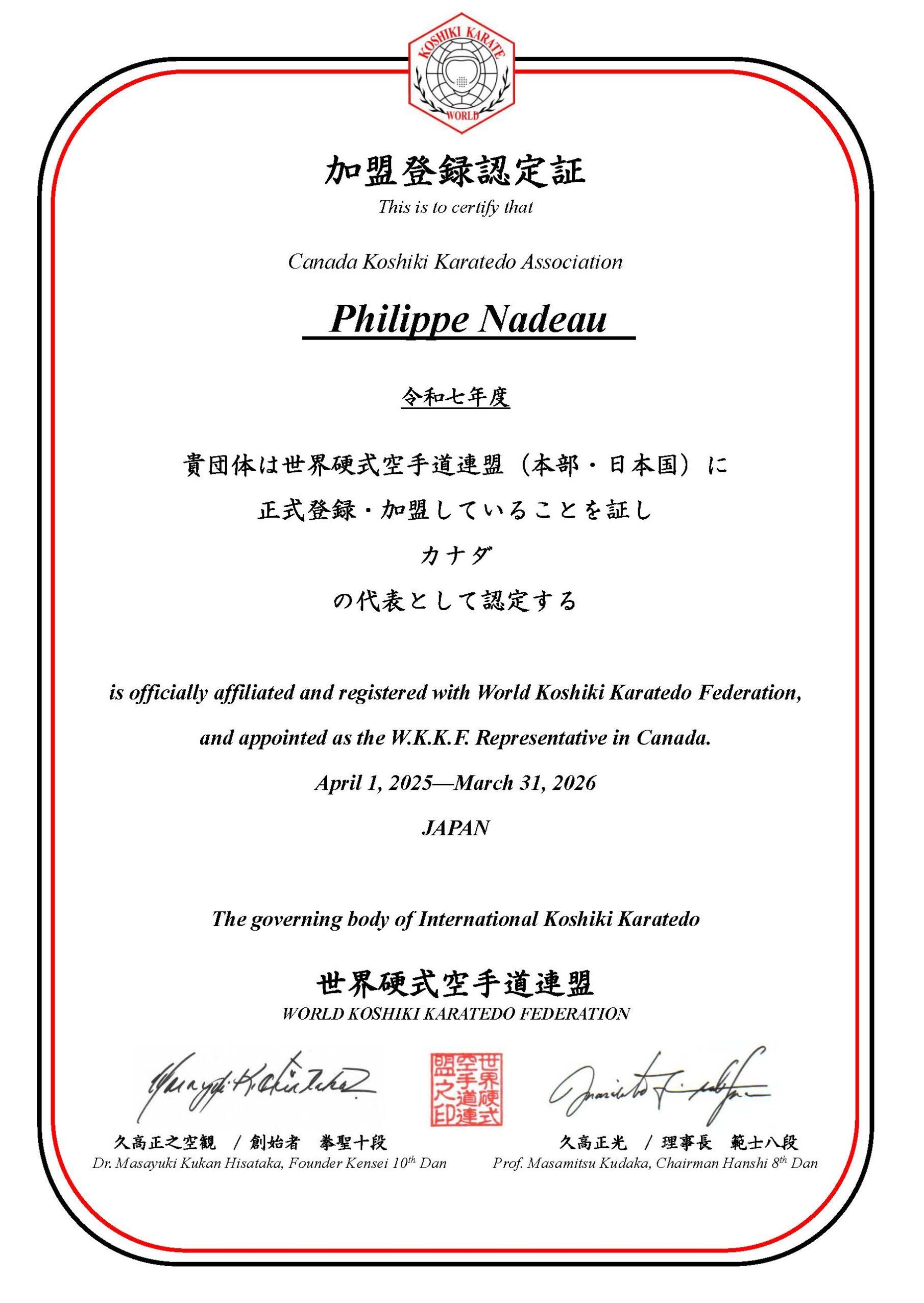CERTIFICAT D’AFFILIATION À LA WORLD KOSHIKI KARATEDO FEDERATION
